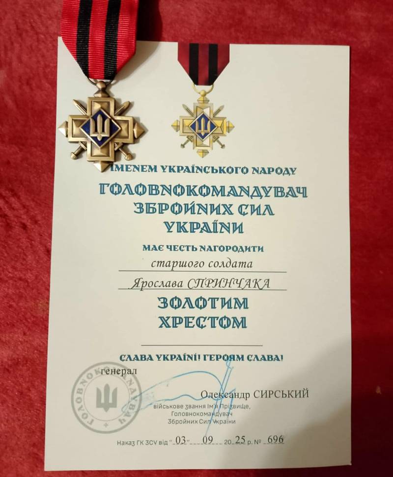 Старшого солдата Ярослава Спринчака нагороджено «Золотим хрестом» – відповідно до наказу Головнокомандувача Збройних сил України від 3 вересня 2025 року №696, підписаного генералом Олександром Сирським.