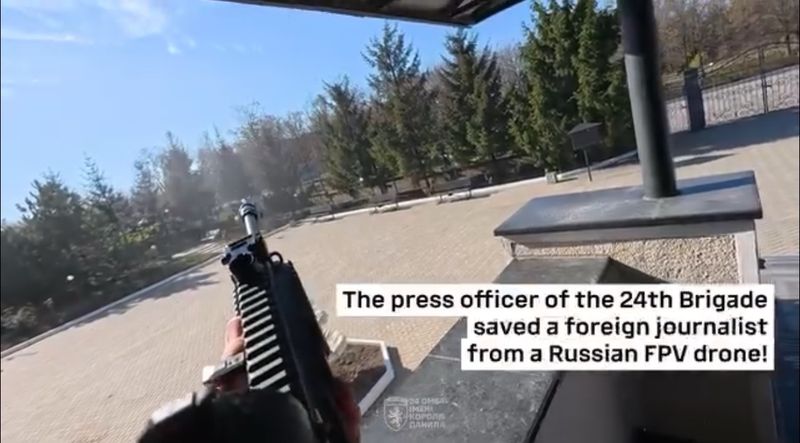 Офіцер відділення комунікації 24 бригади Олег Петрасюк вчасно помітив дрон противника та поцілив його з автомата. Це зберегло життя побратимів та журналістки”.