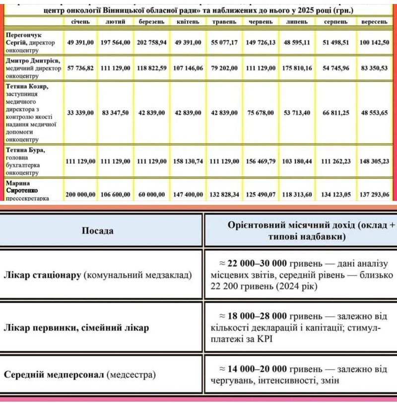 «Як вам зарплата прессекретаря та бухгалтера Вінницької онколікарні? Хворі остання віддають, бо у лікарні не вистачає грошей на закупівлю ліків, а тут зарплати у рази вищі ніж у хлопців на нулі. А для порівняння друга світлина – це зарплати лікарів та медсестер.