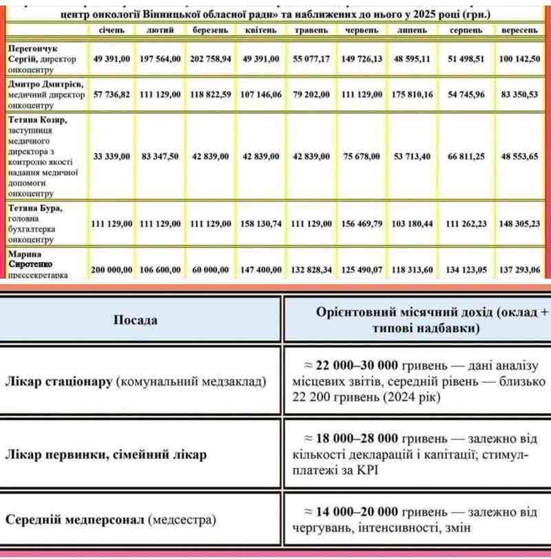 «Як вам зарплата прессекретаря та бухгалтера Вінницької онколікарні? Хворі останнє віддають, бо у лікарні не вистачає грошей на закупівлю ліків, а тут зарплати у рази вищі, ніж у хлопців «на нулі». А для порівняння друга світлина — це зарплати лікарів і медсестер.