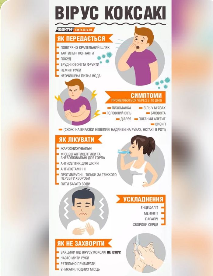 У Київській області захворіли 13 дітей. Хвороба маскується під ОРВІ: температура, біль у горлі, головний біль, нудота або діарея. Основний симптом — водянисті пухирці в роті, на долонях і ступнях.