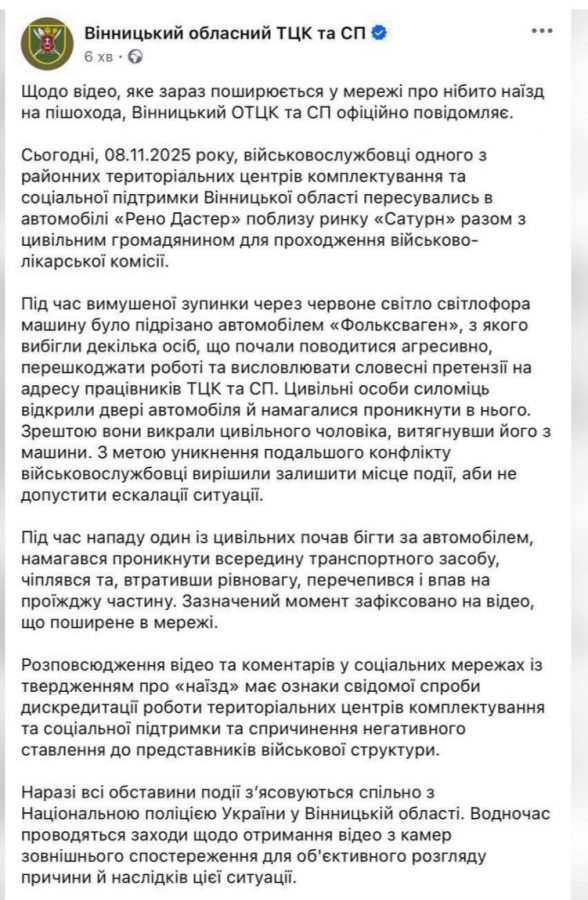 “Щодо відео, яке зараз поширюється у мережі про нібито наїзд на пішохода, Вінницький ОТЦК та СП офіційно повідомляє.