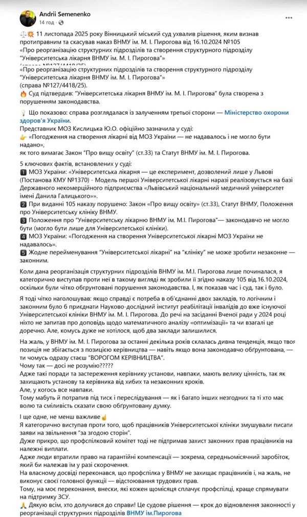 «Суд підтвердив: Університетська лікарня ВНМУ ім. М. І. Пирогова була створена з порушенням законодавства», — заявив професор.