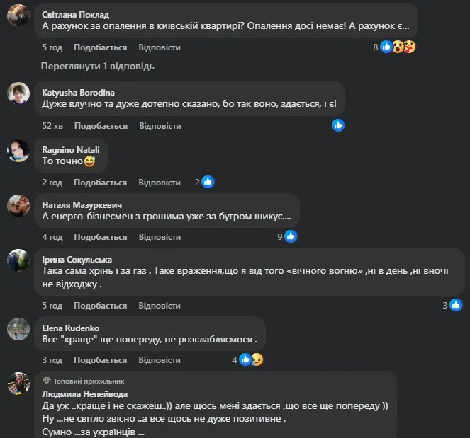 Пост миттєво зібрав сотні коментарів. Користувачі підтримали продюсерку, згадуючи власні рахунки, відсутнє опалення та «космічні» досягнення енергетичних монополій. І навколоенергетичних “груп впливу”.