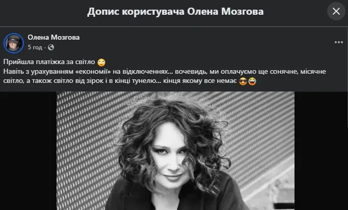 Продюсерка Мозгова несподівано висловилася про високі тарифи на електроенергію. Її пост у Facebook викликав хвилю коментарів — від іронії до гострої критики енергетичної системи.