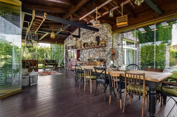На території маєтку облаштовано простору терасу з меблями для відпочинку, а також є великий басейн. Впорядковане подвір’я з рівним газоном і висадженими деревами займає значну частину ділянки. Окремо розташовано технічне приміщення.