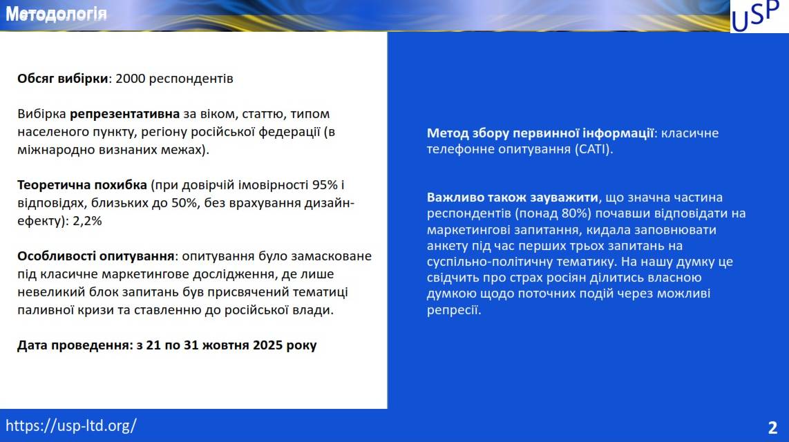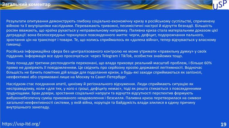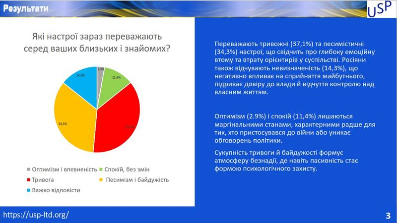 Переважання тривожних і песимістичних настроїв у поєднанні з високою недовірою до влади вказує на глибоке емоційне виснаження російського суспільства та ерозію легітимності державних комунікацій; такі дані соціологічного дослідження, проведеного Українським соціологічним порталом протягом жовтня 2025 року.