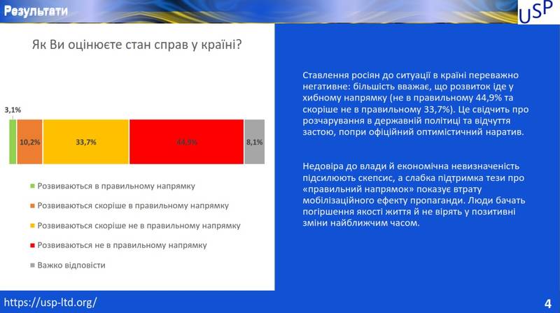 Щодо оцінки загального курсу країни, більшість росіян вважають, що події розвиваються у хибному напрямку: «скоріше не в правильному» – 33,7%, «повністю неправильному» – 44,9%. Це відображає розчарування політикою влади і відчуття застою.