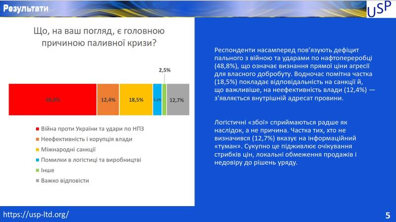 Причини дефіциту пального найчастіше пов’язують безпосередньо з війною та ударами по нафтопереробці – 48,8%. Ще 18,5% покладають відповідальність на санкції та неефективність влади; 12,7% не визначились. Такий баланс відповідей підсилює очікування зростання цін і недовіру до рішень уряду.