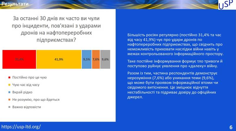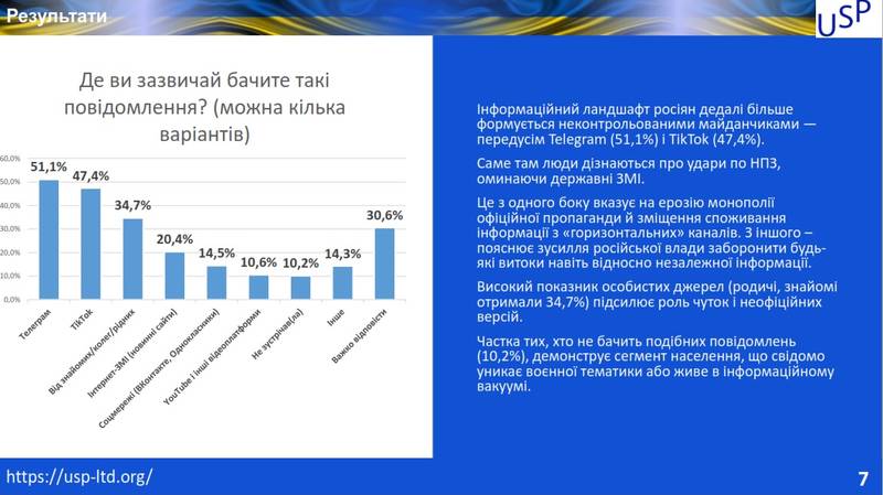 Інформаційний фон про удари по НПЗ є стійким: 31,4% чують про це постійно, 41,9% – час від часу; 17,1% уникають теми чи не орієнтуються. Ключові канали – Telegram (51,1%) і TikTok (47,4%), а також особисті контакти (34,7%), що вказує на ерозію монополії офіційних ЗМІ.