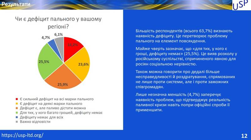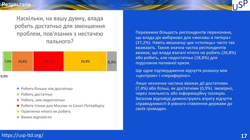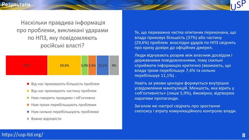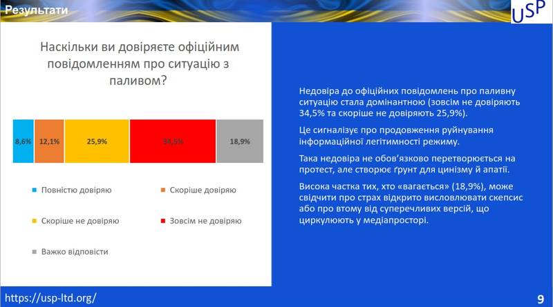 Довіра до повідомлень влади про паливну ситуацію низька: 66,6% вважають, що влада приховує реальний масштаб проблем, ще 18,5% – що перебільшує; лише 5,9% говорять про «об’єктивність». Сукупно 60,4% прямо не довіряють офіційним комунікаціям.
