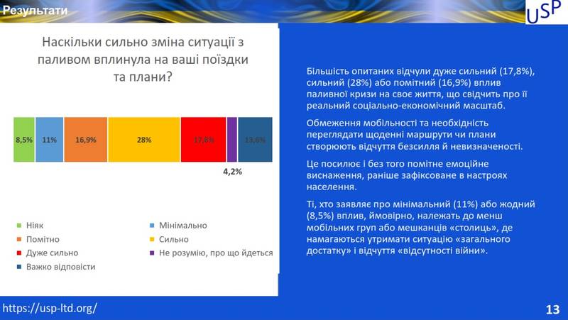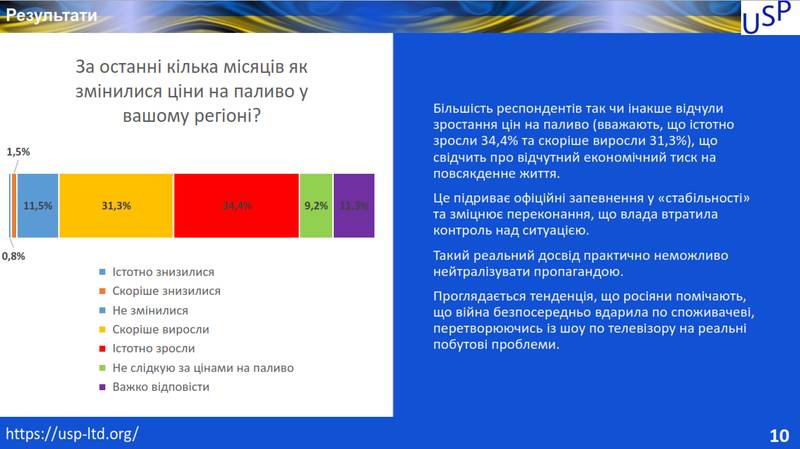Економічні наслідки відчутні: 65,7% заявляють про подорожчання пального. Масовими є й збої в доступі до пального: черги – 60,6%, дефіцит – 58,2%, закриття АЗС – 52,1%. Частина аудиторії або проблем не відчула (14,5%), або відмовилась відповідати (10,7%).