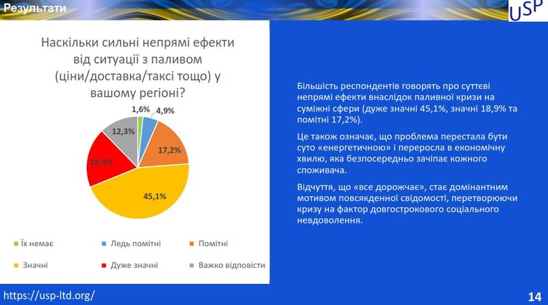 Особистий вплив кризи значний: 45,8% відчули «сильний» або «дуже сильний» вплив; лише 19,5% – «мінімальний/жодний». При цьому 64% говорять про «значний/дуже значний» вплив на суміжні сфери – від логістики до цін на товари й послуги.