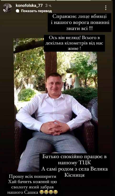 За інформацією нареченої загиблого, його звати Олександр Конофольський, він родом з містечка Ямпіль, що на Вінниччині. Стріляв у нього старший лейтенант поліції Владислав Фаренюк — житель міста Вінниця, який нині є командиром взводу № 2 роти № 21 батальйону № 2 ЗБП «Скеля».