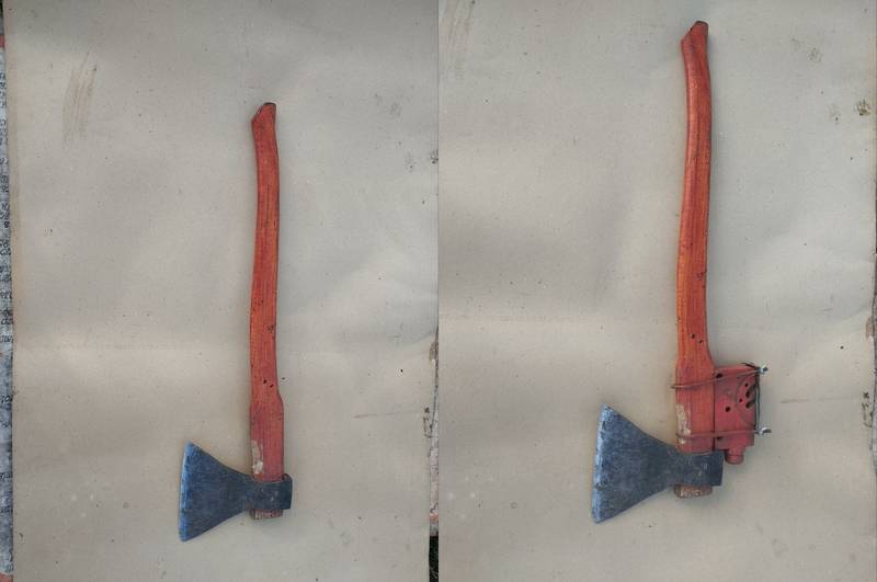 Викладачі та студенти нашого коледжу розробили модернізовану конструкцію сокири, показану на фото 1. До ручки сокири двома хомутами прикріплюється вантаж, що дозволяє регулювати силу удару.