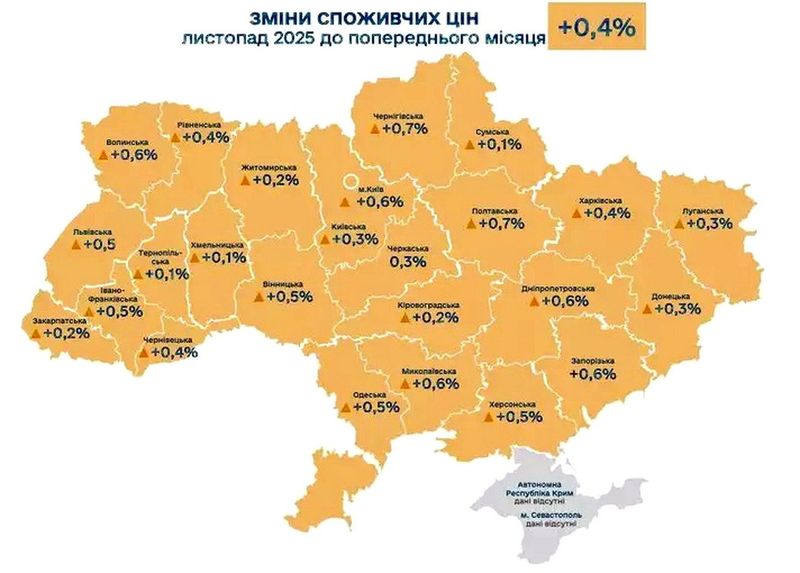 У листопаді 2025 року споживчі ціни в Україні зросли в середньому на 0,4% порівняно з жовтнем. Водночас темпи подорожчання суттєво різнилися залежно від регіону. Про це свідчать дані Державної служби статистики України.