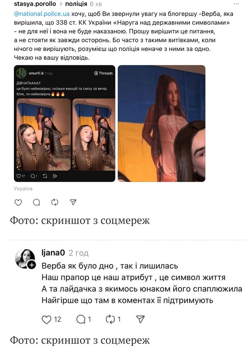 Перший скандал виник через те, що блогерка використала прапор України як фон для своїх фото. Ба більше, на тлі цього прапору, разом з іншим блогером smurfik вона розважалась та позувала.
