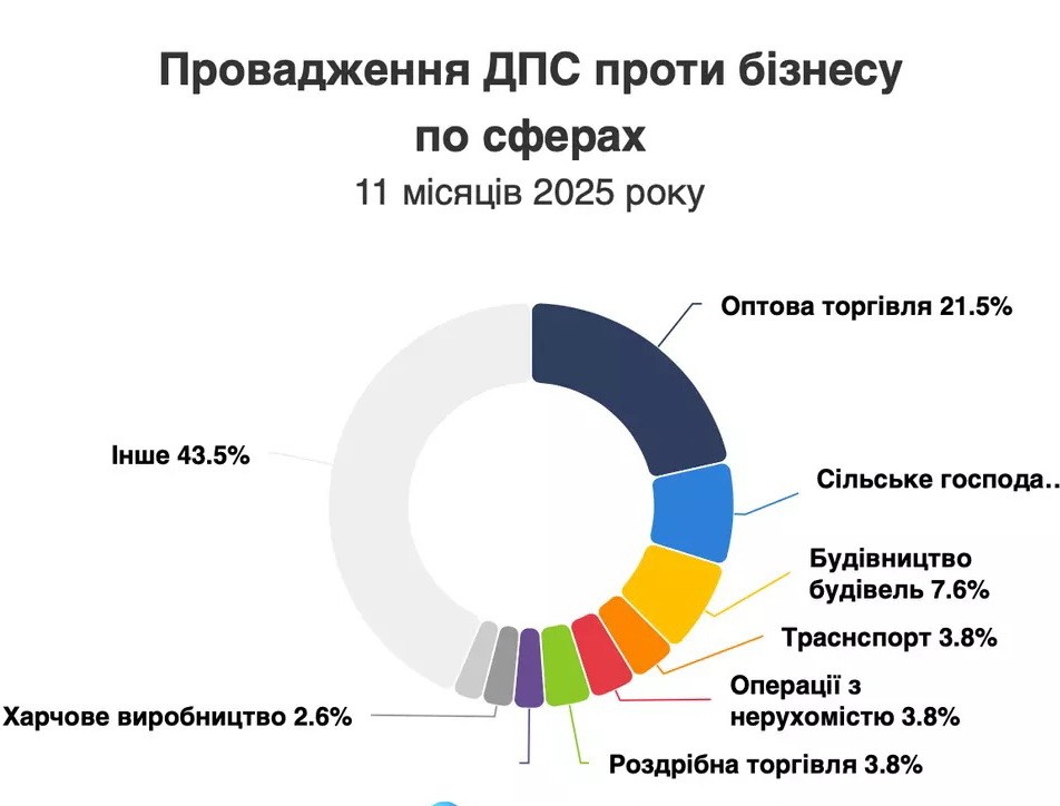Аналітики зазначають: кожне п’яте провадження цьогоріч стосується компаній у сфері оптової торгівлі — це 5 380 справ. На другому місці — сільське господарство та мисливство з 2 092 провадженнями. Третю позицію посідає будівельна галузь — 1 910 справ.