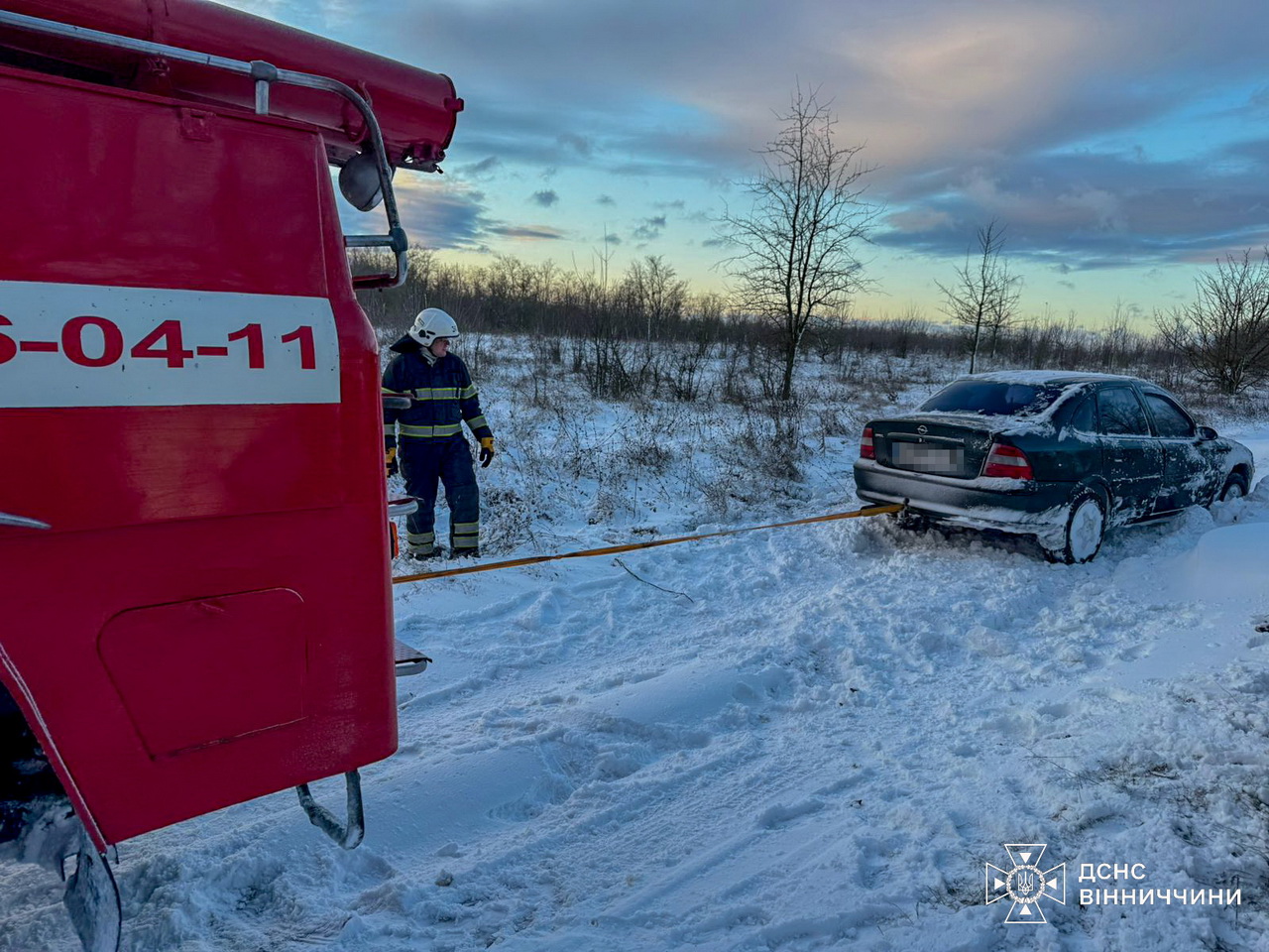 В с.Заозерне Ладижинської громади та с.Джурин Жмеринського району бійці ДСНС допомогли водіям відбуксирувати зі снігових заметів авто.