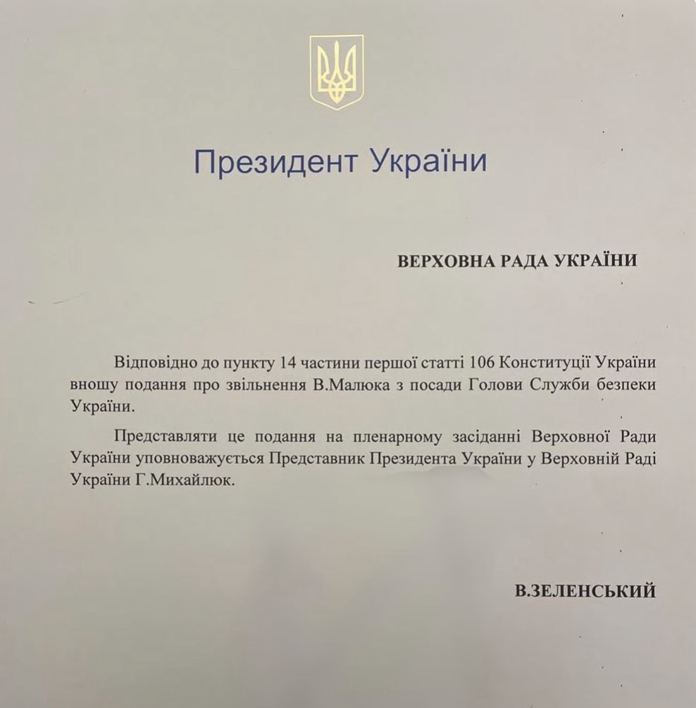 Стефанчук зазначив, що сьогодні до Верховної Ради надійшло подання Володимира Зеленського про звільнення Василя Малюка з посади очільника Служби безпеки України.