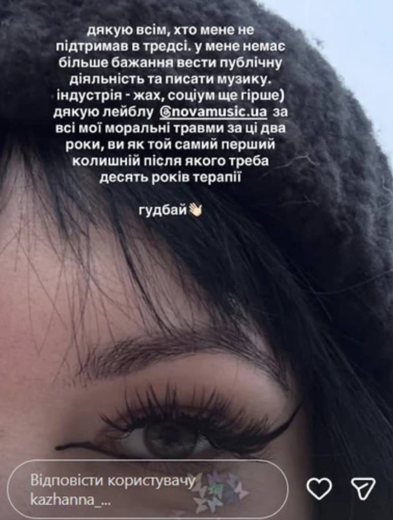 “Дякую всім хто мене не підтримав у тредсі. У мене немає більше бажання вести публічну діяльність та писати музику. Індустрія – жах, соціум ще більше. Дякую лейблу Nova Music за всі мої моральні травми за ці два роки. Ви як той самий перший колишній після якого треба десять років терапії. Гудбай”, – написала виконавиця у своєму Instagram.