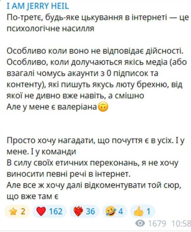 “Це дуже важко стягувати. По-друге, чому це все під час відбору? По-третє, будь-яке цькування в інтернеті — це психологічне насилля. Особливо коли воно не відповідає дійсності. Особливо, коли долучаються якісь медіа (або взагалі чомусь акаунти з 0 підписок та контенту), які пишуть якусь люту брехню, від якої не дивно вже навіть, а смішно. Але у мене є валеріана”, – написала Яна.