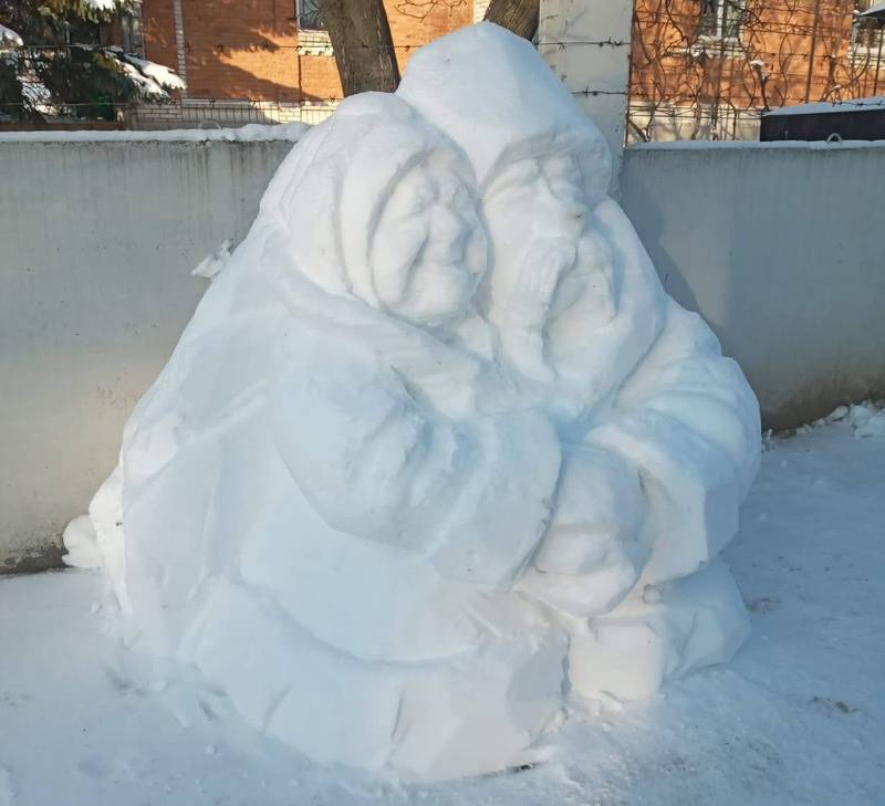 “БАБКАДІД”, – підписав одну з робіт скульптор. Снігові дід і баба ніби ведуть тиху розмову. А також сніговий чоловік на лавці, впізнаваний і дуже «живий» у своїй простоті. Цю композицію автор назвав “ЗВІР ЛІНИВИЙ”. Як видно, скульптури вирізняються деталями та настроєм — у кожній з них відчувається характер і людське тепло, попри холодний матеріал. Роботи викликають усмішки, змушують зупинитися й уважніше придивитися.