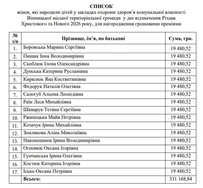 Виконавчий комітет Вінницької міськради ухвалив рішення виплатити грошові премії 17 жінкам, які народили дітей у дні святкування Різдва та Нового року. Сума кожної виплати становить 19 480,52 грн (з урахуванням податків). Загалом із бюджету громади на це спрямували 331 552 грн.