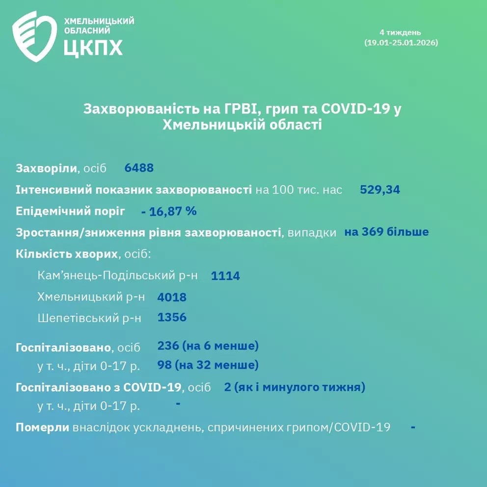За даними епідеміологів, протягом 4-го тижня року — з 19 по 25 січня 2026 року — в області захворіли 6 488 осіб. Інтенсивний показник захворюваності становить 529,34 випадка на 100 тисяч населення. Втім, це менше на 16,87% менше за епідемічний поріг. Порівняно з попереднім тижнем, кількість хворих зросла на 369 осіб.