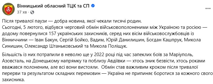 “Додому повернулися 157 українських захисників, серед них вісім військовослужбовців із Вінниччини — Іван Бакун, Сергій Бойко, Вадим, Юрій Данилишин, Богдан Кашпрук, Микола Синишин, Олександр Штаньковський та Микола Поліщук”, – йдеться у повідомленні.
