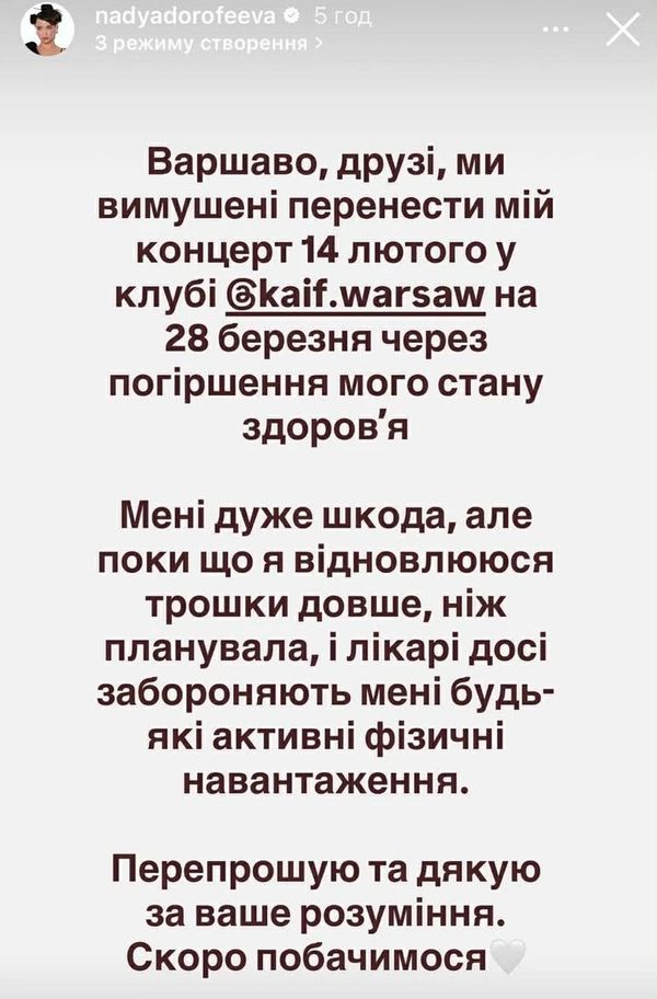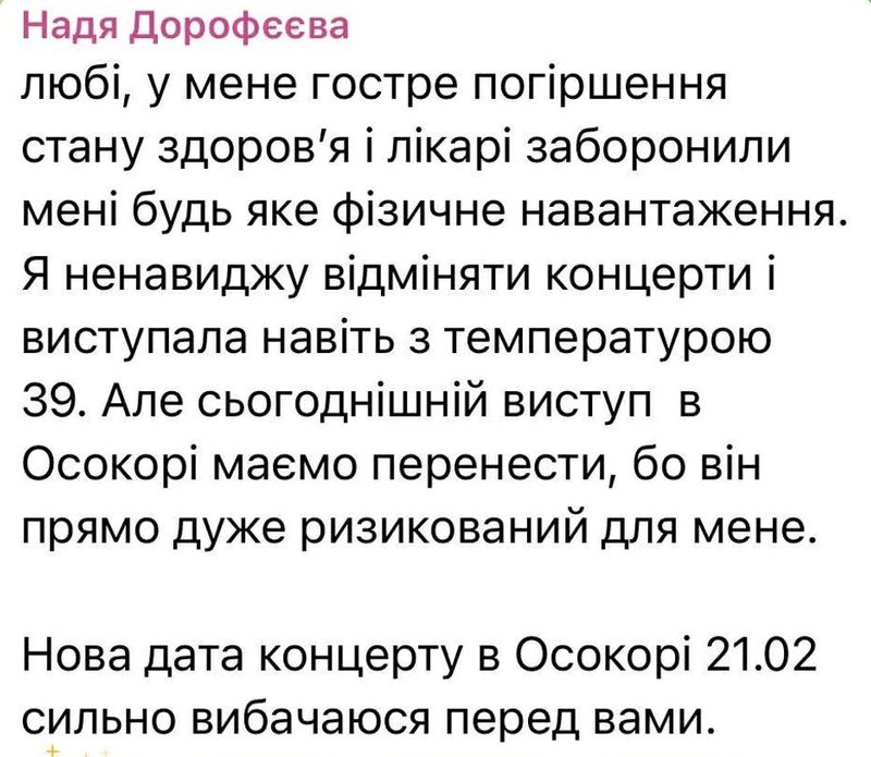 Українська співачка Надя Дорофєєва зізналася у погіршенні стану здоров’я, через що вимушена переносити свої концерти.