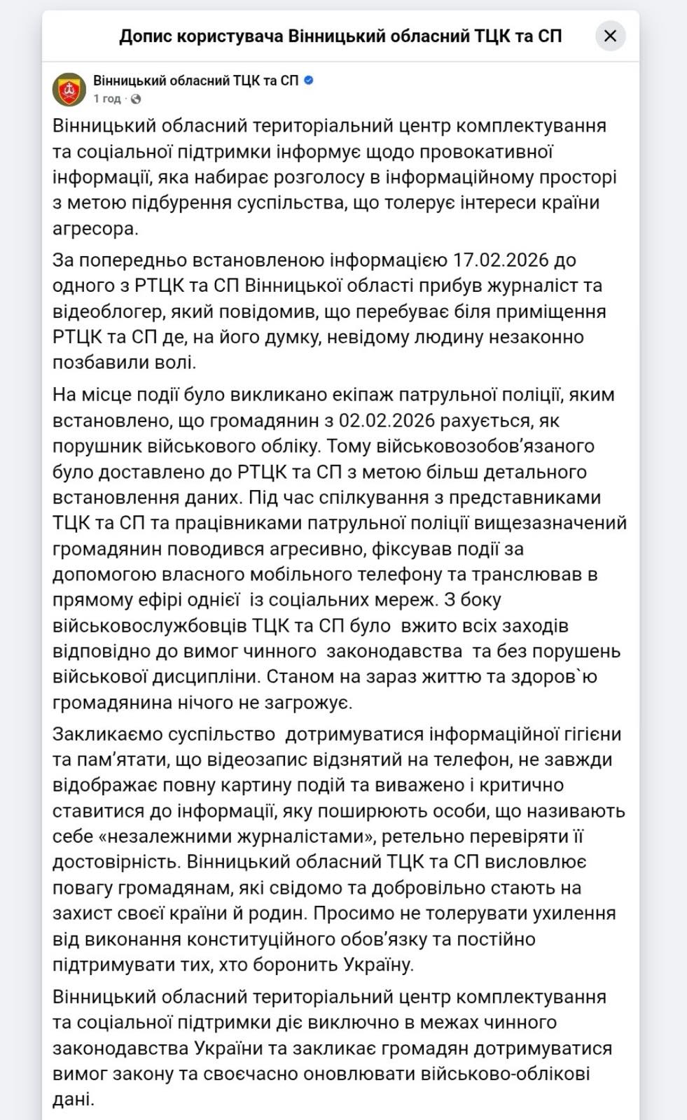 Чоловік знімав відео у ТікТок і розповідав про незаконне позбавлення волі у РТЦК та СП. За словами військовослужбовців, блогер поводився агресивно і з 2 лютого рахується порушником військового обліку. Наразі він знаходиться у навчальній військовій частині.