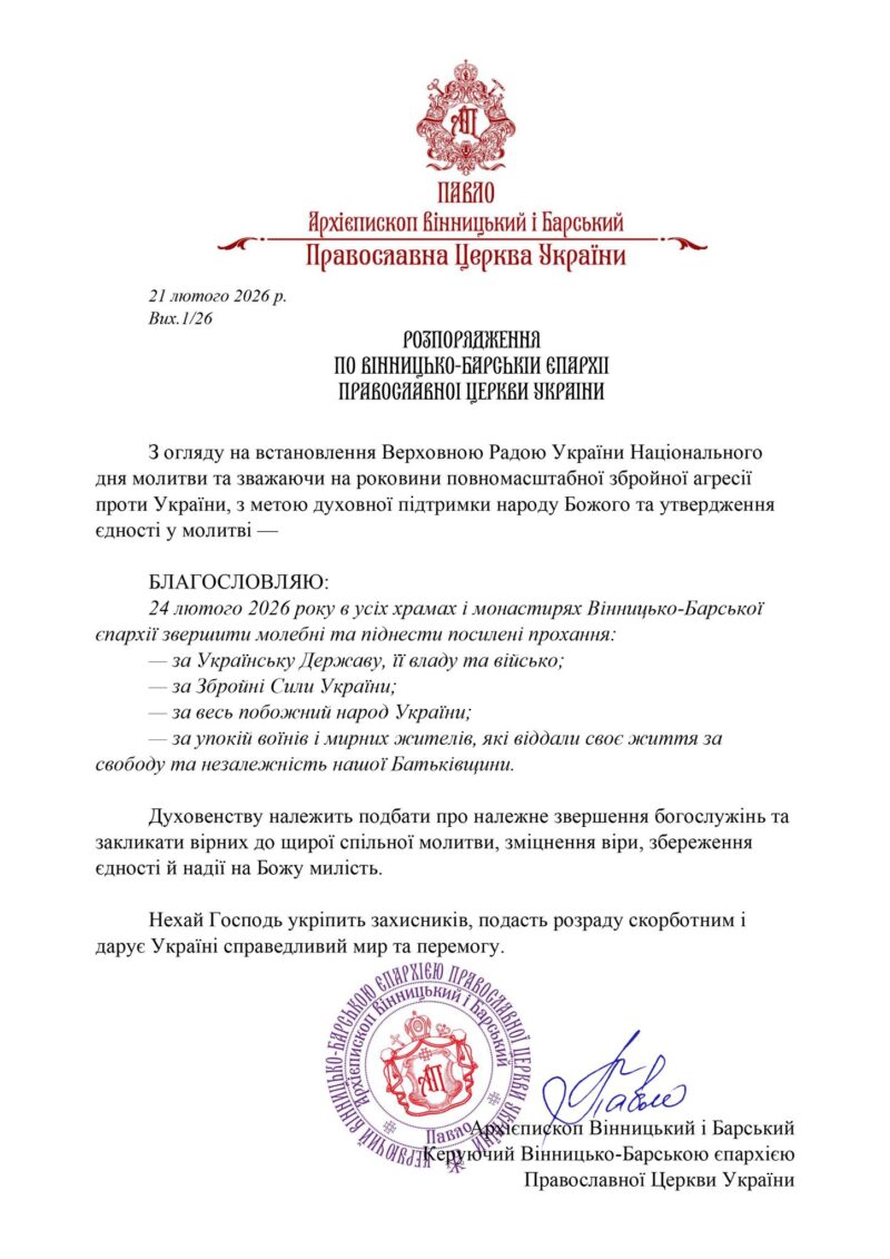 Розпорядження керуючого Вінницько-Барською єпархією щодо звершення богослужінь у Національний день молитви та в четверту річницю повномасштабної військової агресії рф проти України оприлюднили на сайті Вінницько-Барської єпархії ПЦУ.