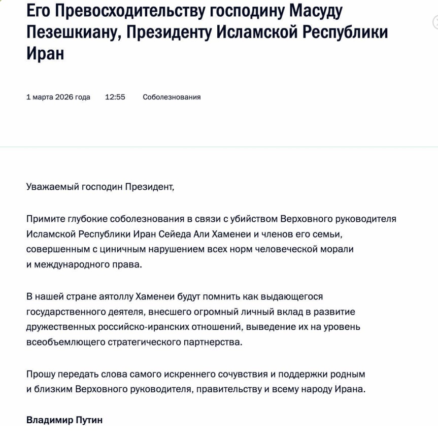 Він заявив, що ліквідація Хаменеї є «цинічним порушенням усіх норм людської моралі та міжнародного права» та назвав його «видатним державним діячем».