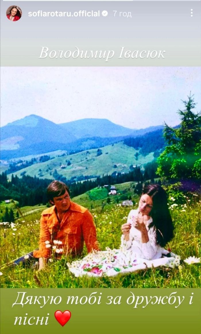 В Instagram-stories артистка опублікувала архівне фото, на якому вона зображена разом із автором безсмертних хітів на тлі карпатських краєвидів. Світлину вона підписала лаконічно та зворушливо: “Володимир Івасюк” і додала слова вдячності: “Дякую тобі за дружбу і пісні”.