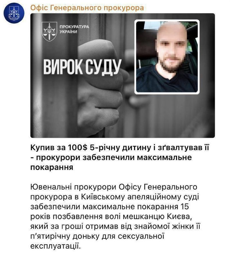 Доведено, що обвинувачений через інтернет познайомився із жінкою та домовився з нею про передачу дитини в обмін на грошову винагороду – 100 доларів США. Після того як “обмін” відбувся – засуджений зґвалтував дівчинку.
