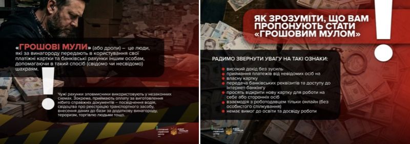 «Грошові мули» (дропи) — це люди, які за винагороду надають доступ до своїх рахунків. Їх використовують у шахрайських схемах, зокрема для фейкових послуг із документами чи авто