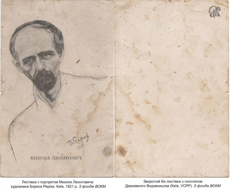 Листівка прямокутної форми, чорно-біла. На лицьовій стороні – поясний портрет композитора Миколи Леонтовича з підписом художника «Б. Реріх. 1921», на звороті у правому верхньому куті мініатюра – логотип Державного видавництва.