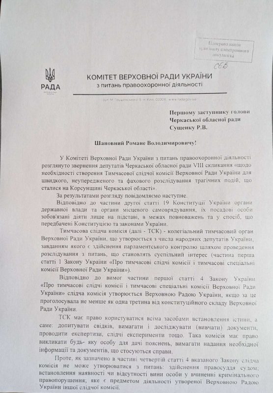 Нагадаю, що Черкаська обласна рада підтримала ініціативу парламентської фракції “Європейська солідарність” від 4 лютого ц.р. про створення ТСК тимчасової слідчої комісії Верховної Ради України для проведення неупередженого та справедливого розслідування обставин трагедії в селі Нехворощ Корсунь-Шевченківського району Черкаської області 27 січня 2026 року.