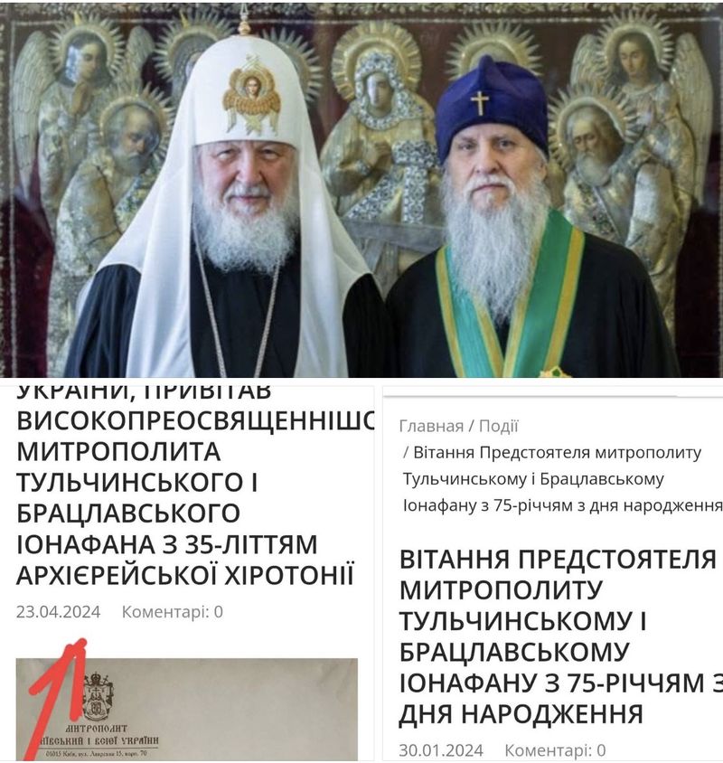 На світлинах – Іонафан Єлецьких з орденом від Гундяєва в жовтні 2024 р. і два хвалебних привітання Іонафану від митрополита Онуфрія – обидва 2024 р. (вирок за 4 статтями кримінального кодексу винесено було Єлецьких ще 2023 р.)