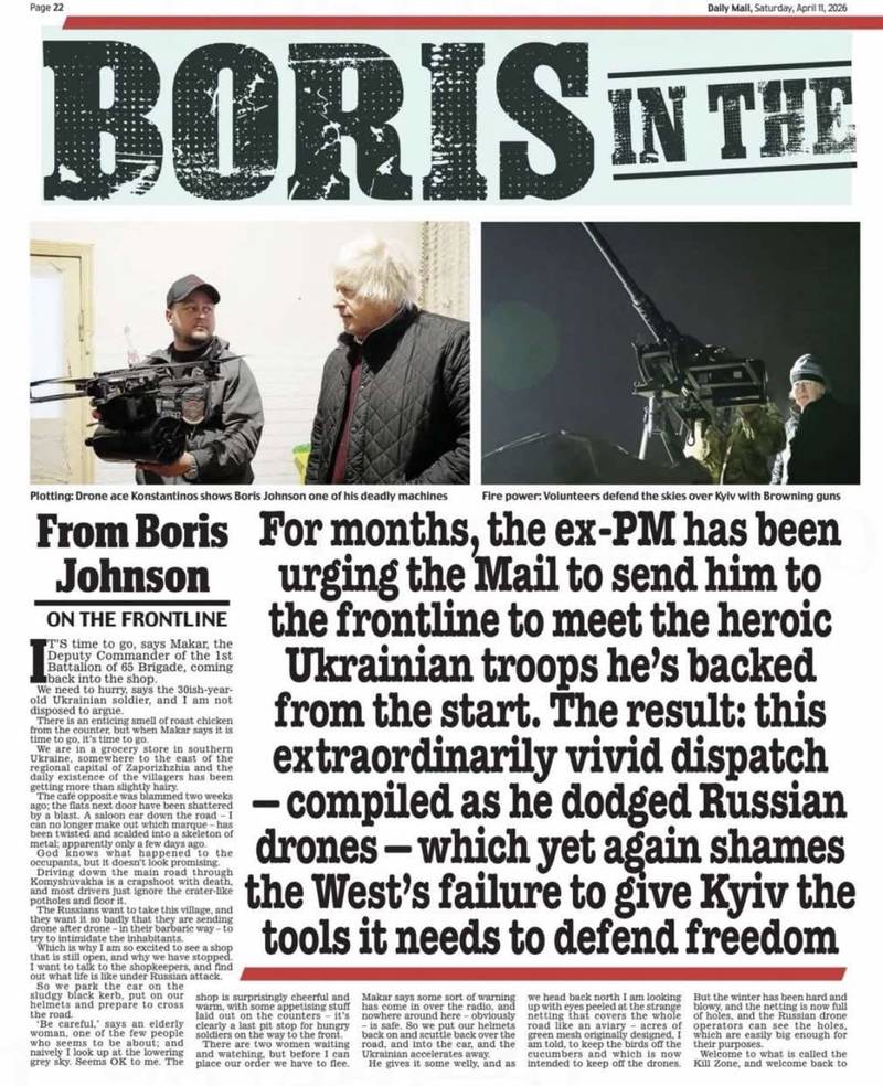 Про це таємне фронтове відрядження відомого політика та колишнього британського прем’єр-міністра, я дізнався від воєнного кореспондента “Дейлі Мейл” Річарда Пендлбері, з яким зустрівся в Лондоні минулого місяця — мене запросили для участі в Медіафорумі. Річард якраз разом із фотографом Джеймі Вейзманом повернувся з України і розповів: Борис наполегливо попросив фронтову команду Daily Mail організувати таку поїздку на передову. Домовились: фото притримати і публікувати одночасно з виходом матеріалу в газеті. Оскільки саме загострилася війна навколо Ірану, то вихід публікації відкладався. І ось цей момент настав.