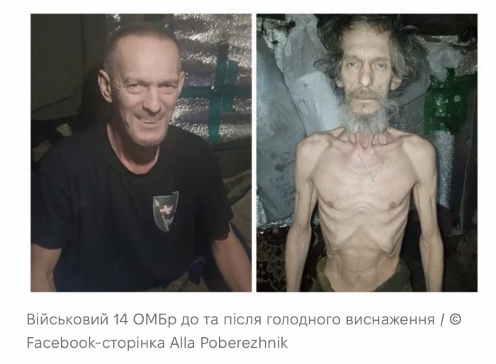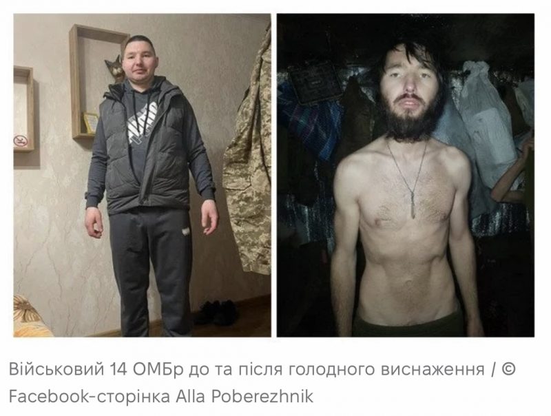 Facebook-користувачка Alla Poberezhnik опублікувала фото військових з 14-ї бригади до та після сильного виснаженням голодом та спрагою.