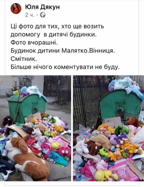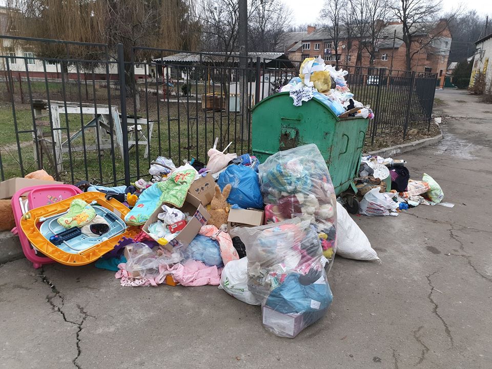 -Сьогодні, волонтери, які знають мене особисто та моє відношення до волонтерської допомоги, скинули мені посилання на цей пост із цими кричущими фото.Не довго думаючи, будучи як раз в місті, розвертаю машину і їду на смітник біля дитячого будинку “Малятко”. На місці зв’язалась з департаментом охорони здоров’я, які приїхали до нас вже за хв.15. Зустрілись із керівництвом закладу…Багато можна говорити про те чи потрібні закладу і дітям у ньому ті викинуті іграшки…Чому заклад знаючи про те, що такі іграшки не можна брати, все одно брав їх. Те, що я побачила, дійсно, жахливо негативне відношення до отриманої допомоги???.Так, буду відвертою, там було багато зламаних іграшок і порваних речей.Але й були досить нормальні і іграшки, і речі. Працюючи з багатодітними сім’ями в районах я знаю, що таких речей, як ота блакитна курточка ?(трохи прийшлось поритись у тій купі) більшість з них не мають!!!
