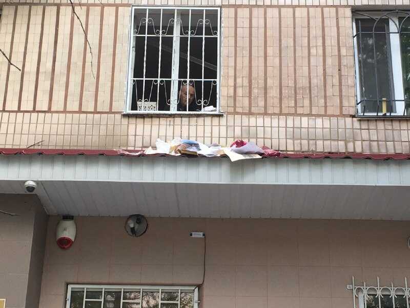 Окрім старого паперу пенсіонер намагається викинути щей важкі предмети. Чоловік не зважає на те, що під під його вікном ходять літні жінки та маленькі діти.